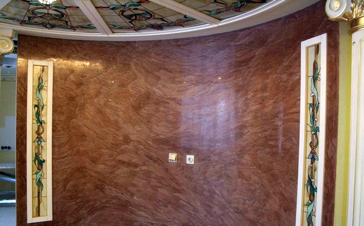 Імітує поліровані натуральний камінь (граніт, вапняк, малахіт), жатую тканину і тиснену шкіру. Після нанесення на стінах з’являються об’ємні малюнки. Не вимагає особливих методик догляду. Відштовхує бруд.