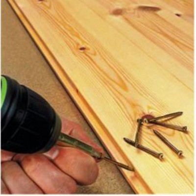 - Перший ряд дощок укладаємо чітко по лінії, розгортаємо шипом до стіни. Закріплюємо саморізами в шип, попередньо засверливая отвори. При цьому довжина шурупів повинна бути в 2-2,5 рази більше товщини дошки.
