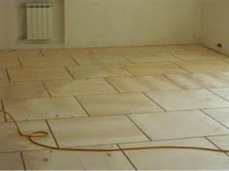 - Починаємо укладати листи фанери, відступивши 10 см від стіни, робимо зазор між усіма полотнами в 2-3 мм.