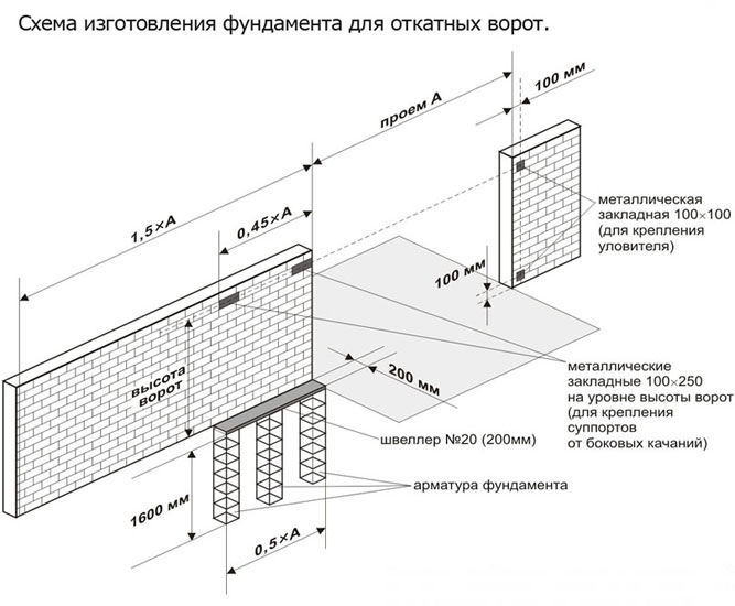 Збірка і установка відкатних воріт здійснюється в суворій послідовності. Роботи починаємо з викопування траншеї під фундамент. Її ширина повинна становити 40-50 см, глибина — від 1,7 до 3 м, в залежності від ступеня промерзання грунту в певній місцевості. При цьому довжина майбутнього бетонної основи дорівнює половині ширини проїзду.