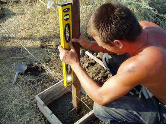 Далі, використовуючи рівень, робиться регулювання стовпів. Стежте, щоб вони були встановлені строго вертикально. Після цього їх треба засипати уламками цегли або камінням.