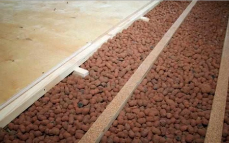 Наступний шар – утеплювач можна влаштувати його з керамзиту. Шаром в 100-150 мм його необхідно рівномірно насипати і розподілити по всій площі. Керамзит – натуральний, екологічно чистий матеріал, який виготовляється на основі глинистих сполук. Його шар 100 мм здатний замінити 1м цегляної кладки або ? м дощок. Щоб отримати необхідний результат, слід точно дотримуватися технологію виконання робіт. Суміш повинна складатися різних за розміром гранул. Основною фракцією повинен служити керамзит діаметром 10 см, до якого додається матеріал інших фракцій. Це перешкоджає усадці утеплювача: дрібні гранули розклинюють більш великі. Переконатися в тому, що шар насипаний рівному, можна за допомогою волосіні, прикладеної до маяків.