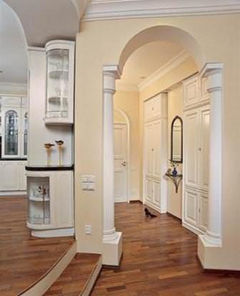 - Колонами і напівколонами можна прикрасити вхід у кімнату і сховати в них полки.