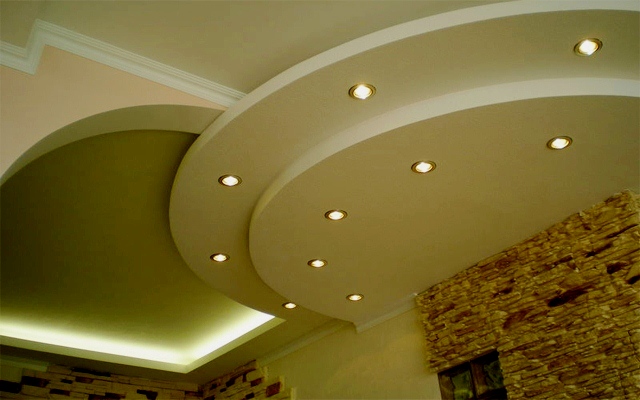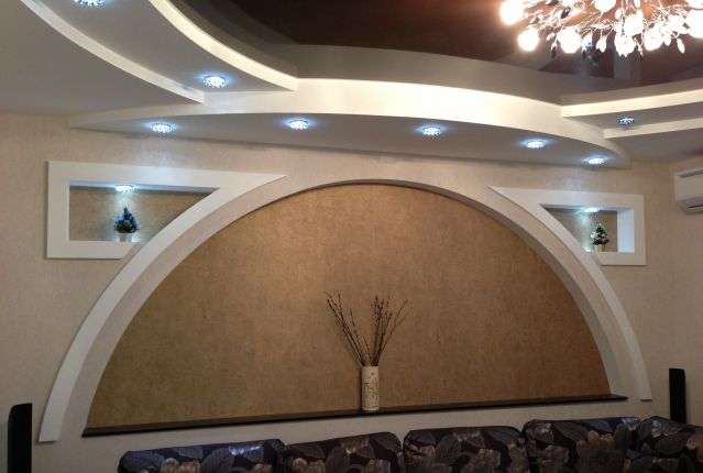 - У величезних залах з високими стелями кілька ярусів гіпсокартону і ряди підсвічують лампочок створять ефект урочистості. І в той же час в невеликій кімнаті подібний пристрій викличе ефект нагромадження і візуально зменшить простір. Так що в будь-якому випадку дуже важливо не перестаратися.