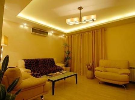 - Якщо ви живете в звичайній квартирі з середньою висотою стелі, то одного рівня гіпсокартону буде цілком достатньо, щоб створити вигадливу композицію гри світла і тіні, при цьому зберегти розміри і відчуття простору. При цьому слід пам’ятати, що гіпсокартон «з’їдає» 15 сантиметрів висоти стіни, так що чим нижче стеля в кімнаті, тим менше можливостей для багаторівневих конструкцій.