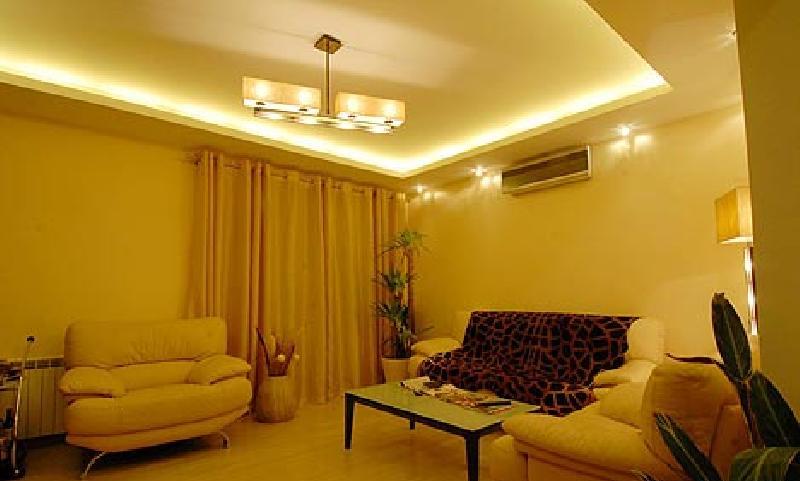 - Якщо у якості підсвічування ви вибрали неонові трубки, дюралайт або світлодіодні стрічки, необхідно влаштувати спеціальні ніші – поглиблення між рівнями гіпсокартону. Таким чином, при укладанні світильного обладнання воно буде ніби «утоплена» всередину, тобто самі трубки або стрічки видно не буде – буде видно тільки струмує світло, який стане проникати назовні.
