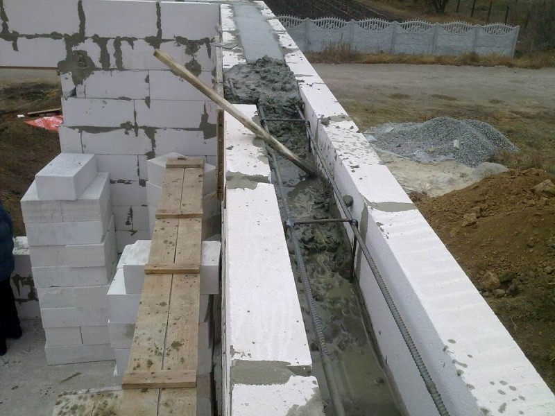 Бетон для монолітного поясу треба укладати шарами, кожен з яких добре утрамбовується кельмою. Метал, особливо на дні, повинен бути щільно залитий матеріалом. Після того, як кільцева балка повністю готова, весь зайвий бетон варто видалити якомога швидше. Якщо ж є виступаючий гравій, то він утопляется в наповнювачі. Застигати бетон буде близько трьох днів. Для зведення стін на пояс наноситься тонкий шар розчину.