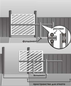 Рух конструкції здійснюється за допомогою жорстких профільованих направляючих, іншими словами, балка, яка кріпиться до основи воріт. Напрямна рухається по спеціальній роликовій відкатної візку, яка щільно прилягає до фундаменту з бетону. Конструкція роликів ґрунтується на закритих підшипниках кочення, куди виробник додає таку кількість змащення, щоб вистачило на весь період експлуатації.