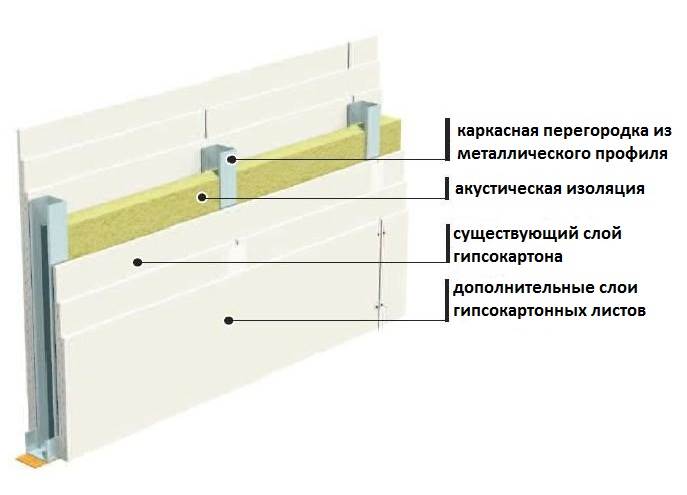 Сама по собі гіпсокартонна конструкція має низький рівень захисту приміщення від звуків. Особливо це відчувається при наявності в приміщенні перегородок з ГКП. Щоб уникнути подібних проблем порожнини між листами гіпсокартону прокладаються спеціальним звукоізоляційним матеріалом. Дотримуючись рекомендованої виробниками технології можна домогтися не тільки відмінного звукопоглинання, але і значно скоротити рівень тепловтрат.