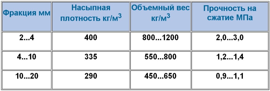 Таблиця порівняльних властивостей керамзиту, виходячи з розміру фракцій