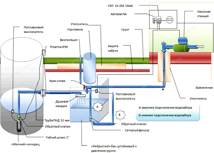 Важливий нюанс: якщо підземні води лежать (мають залягання) нижче глибини в 2 метри, то колодязь споруджувати доведеться — відведеної трубою тут вже не обійтися. Втім, в середній смузі Росії це буває рідко.