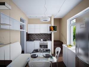 Компактну меблі, яку бажано використовувати світлої кухні, слід розосередити в різних зонах їдальні так, щоб світло від вікна вільно проходив у глибину кімнати і рухався у всіх напрямках ергономічно і зручно.
