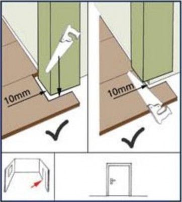 В місцях дотику ламінату коробки і дверного прорізу необхідно класти ламінат врівень самої коробки. Тому, якщо дверна коробка вже встановлена, доведеться взяти спеціальну пилку і вирізати знизу частина стійки коробки. Висота вирізу повинна відповідати товщині ламінату. Після чого необхідно підрізати панель ламінату таким чином, щоб вона частково чи повністю перекривала поріг і заходила під дверну коробку. Остаточно зафіксувати її можна за допомогою струбцини. Щоб поріг виглядав красиво, і не було різких перепадів, слід використовувати спеціальний фіксуючий елемент для порогів.