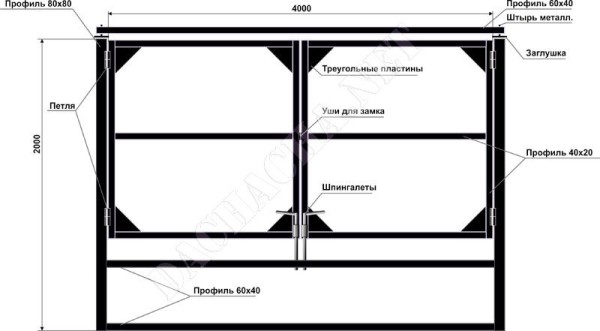 Далі на горизонтальній поверхні починається конструювання рами для хвіртки і стулок, а також монтуються замки і петлі. Не забувайте, що профнастил необхідно кріпити виключно саморізами, зварити в цьому випадку нічого не намагайтеся. Після цього ворота можна навішувати на петлі.