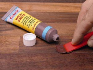 • Ремонтна паста. Застосовується для усунення великих невеликих подряпин і відколів. Продається також в будівельних магазинах і має широкий спектр кольорів. Підбирати пасту слід більш ретельно, ніж восковий олівець, так як на досить великій ділянці різниця в кольорах може бути помітно. Також необхідно буде придбати спеціальний шпатель для нанесення засобу і видалення надлишків. Перед першим застосуванням ремонтної пасти рекомендується попрактикуватися на непотрібною дошці.