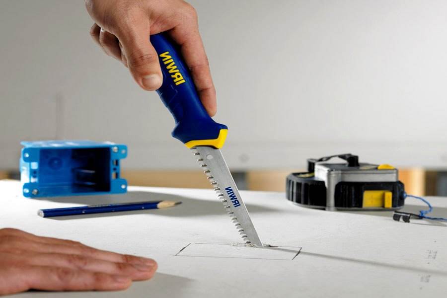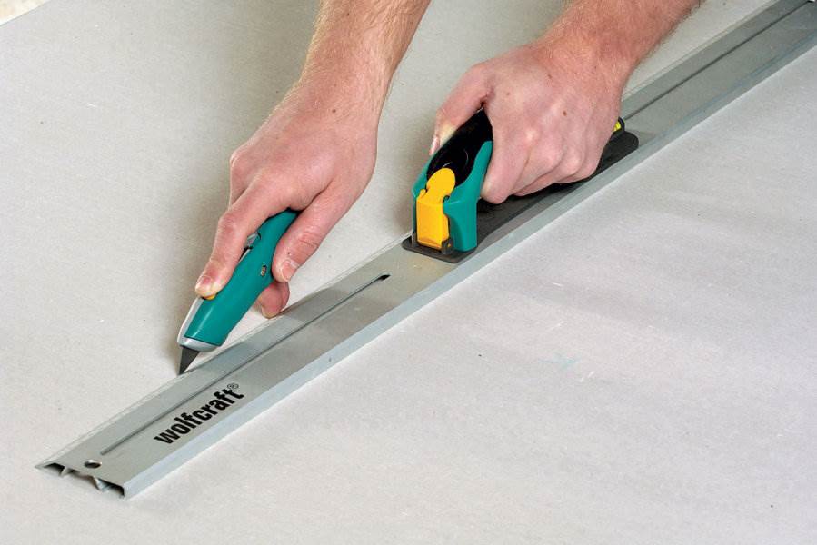 - Будівельний ніж. Будівельний ніж являє собою ріжучий предмет, який дуже схожий з канцелярським ножем. Якщо потрібно розрізати гіпсокартон раз, канцелярський ніж цілком застосовний, але якщо гіпсокартону потрібно нарізати багато, звичайний канцелярський ніж може зламатися. Для одноразового ремонту з застосуванням конструкцій з гіпсокартону цілком достатньо буде посиленого канцелярського ножа (бокскаттера). Простий канцелярський ніж досить крихкий, так як передбачений для різання паперу, а будівельний ніж коштує значно дорожче. Такий ніж без праці розріже лист гіпсокартону, однак, щоб домогтися ідеально рівного розрізу, доведеться потрудитися. Після розрізу листа ГКЛ бокскаттером або будівельним ножем на гіпсокартоні утворюються нерівності і зазублини на місці розрізу. Їх можна затерти звичайної наждачним папером, а можна цього і не робити, так як при подальших оздоблювальних роботах із застосуванням перфорованого куточка ці дефекти сховаються.