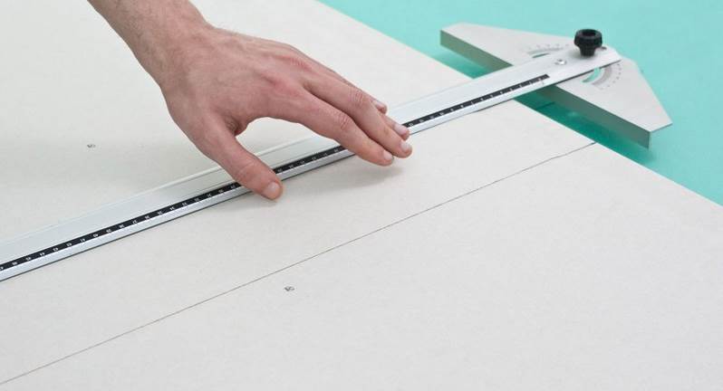 - Прямий розріз. Це значить, зменшити лист до необхідного розміру. З обох сторін відзначте потрібний розмір, прикладіть металеву лінійку і ножем проріжте верхній шар картону. Різати краще по лінійці. Два-три рази розріз потрібно поглибити, щоб лист зламався в потрібному місці. Потім лист поставте на ребро, постукайте коліном по стороні, де лист не прорізаний. Два-три удари (несильних) і гіпсовий сердечник зламається якраз по розмітці.