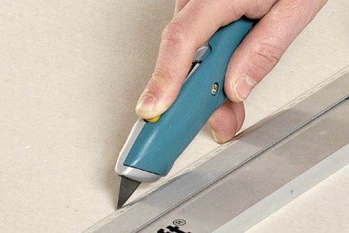 - Будівельний ніж. Будівельний ніж являє собою ріжучий предмет, який дуже схожий з канцелярським ножем. Якщо потрібно розрізати гіпсокартон раз, канцелярський ніж цілком застосовний, але якщо гіпсокартону потрібно нарізати багато, звичайний канцелярський ніж може зламатися. Для одноразового ремонту з застосуванням конструкцій з гіпсокартону цілком достатньо буде посиленого канцелярського ножа (бокскаттера). Простий канцелярський ніж досить крихкий, так як передбачений для різання паперу, а будівельний ніж коштує значно дорожче. Такий ніж без праці розріже лист гіпсокартону, однак, щоб домогтися ідеально рівного розрізу, доведеться потрудитися. Після розрізу листа ГКЛ бокскаттером або будівельним ножем на гіпсокартоні утворюються нерівності і зазублини на місці розрізу. Їх можна затерти звичайної наждачним папером, а можна цього і не робити, так як при подальших оздоблювальних роботах із застосуванням перфорованого куточка ці дефекти сховаються.