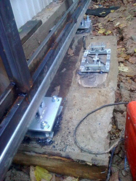 Тепер слід встановити опорні роликові механізми на фундаментній основі у відповідності з кресленням. Для міцності монтажу використовуються металеві планки, які приварюються з двох сторін до основи фундаменту. Потім на них встановлюються регульовані пластини-власники з роликами, які закріплюються силовими болтами.