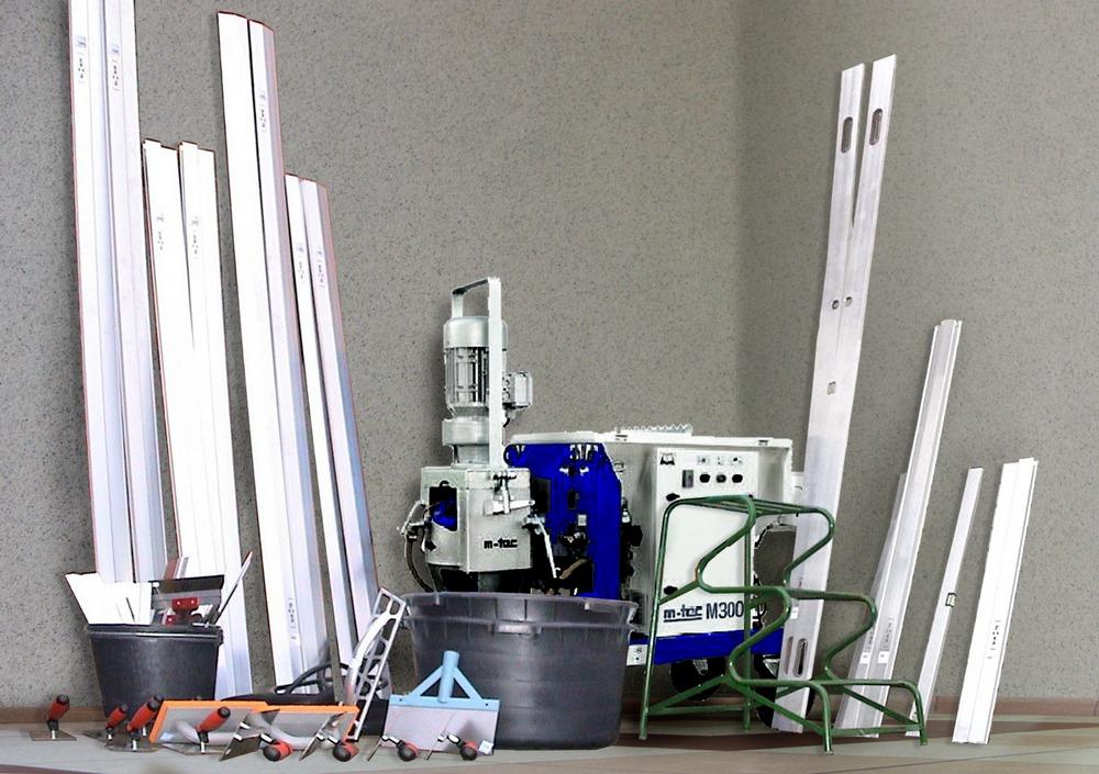 Не забудьте перед роботою підлогу застелити поліетиленовою плівкою. Для робіт з оштукатурення потрібно відро для замісу розчину, кельма, терка, кельма, будівельний спеціальний штукатурний сокіл, а також правило.