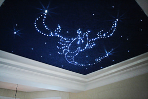 Для влаштування такої стелі застосовується светогенератор і оптоволокно. Це найбільш поширений спосіб пристрою стелі з мерехтливими зірками, який вважається класичним.