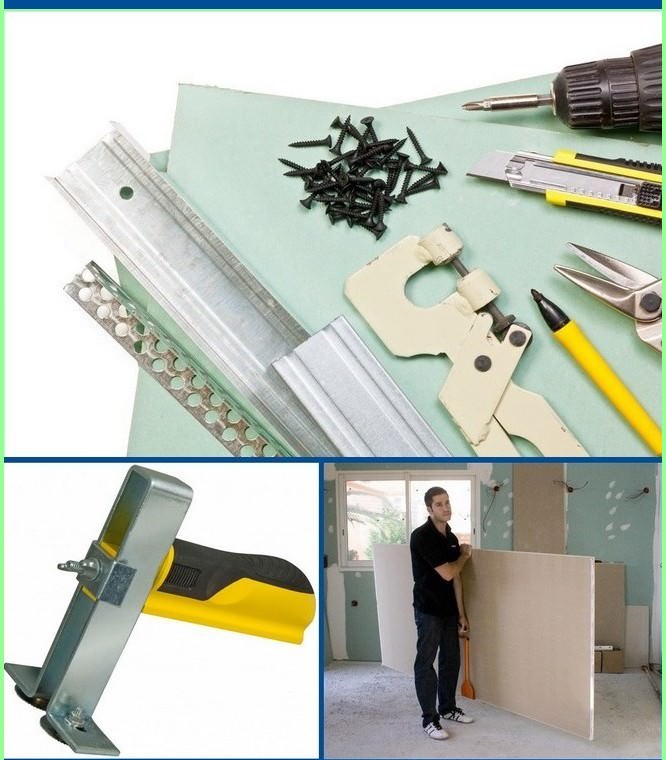 Стандартного набору буде цілком достатньо, а значить, простежте за тим, щоб в домашньому наборі був перфоратор, болгарку, шуруповерт, ніж для гіпсокартону, молоток, шпателі.