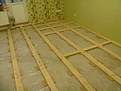 - укладають лаги. Смуги фанери (35 мм завширшки) кріпляться до підлоги клеєм або саморізами. У місцях, де між лагами і дошками є зазори, підкладаємо додаткові бруски фанери;