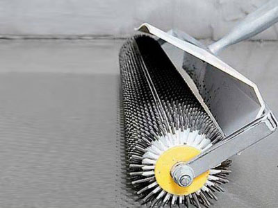 - виливаємо розчин на армовану сітку, гумовим валиком з шипами видаляємо бульбашки повітря, а потім правилом або шпателем розрівнюємо поверхню;