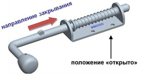 - Засувки з фіксацією на основі пружинної. Ці затвори застосовуються в основному з внутрішньої сторони і найчастіше виступають у ролі додаткових фіксаторів воріт на рівні з основним замком. Їх пружинна конструкція дозволяє без зусиль приводити засувку в дію.