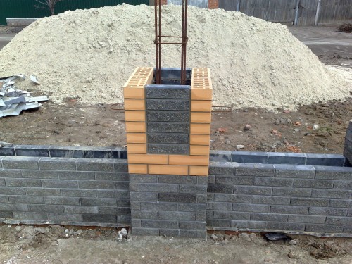 Перед початком кладки цегли робиться гідроізоляція. Можна використовувати руберойд чи подібний матеріал. Колони кладуться на відстані двох метрів, між ними споруджують цоколь товщиною рівною товщині колони (250 мм).