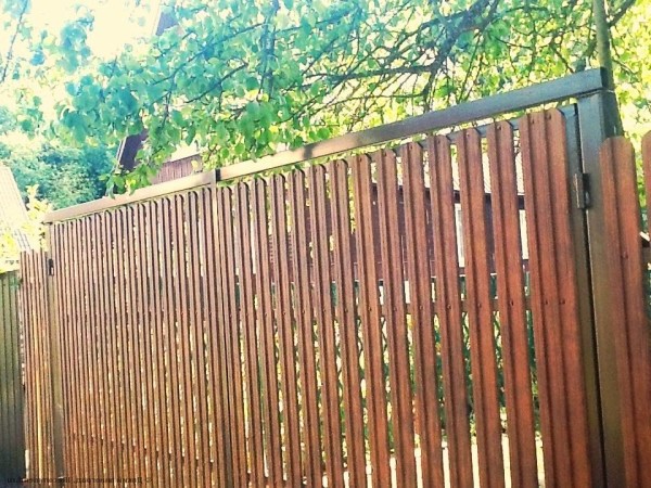 Стовпи встановлюються за тією ж схемою, що і у випадку з сіткою. Відмінність полягає в тому, що замість дроту між стовпами монтується прожилина з дерев’яного бруса або профільної труби.