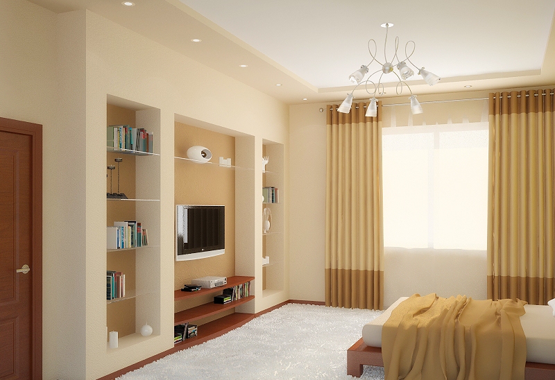В інтер’єрі спальні ніша може служити як елементом декору, де можна помістити колекцію або квіти, так і функціональним елементом, наприклад, полицею для телевізора, де зручно ховати всі шнури.