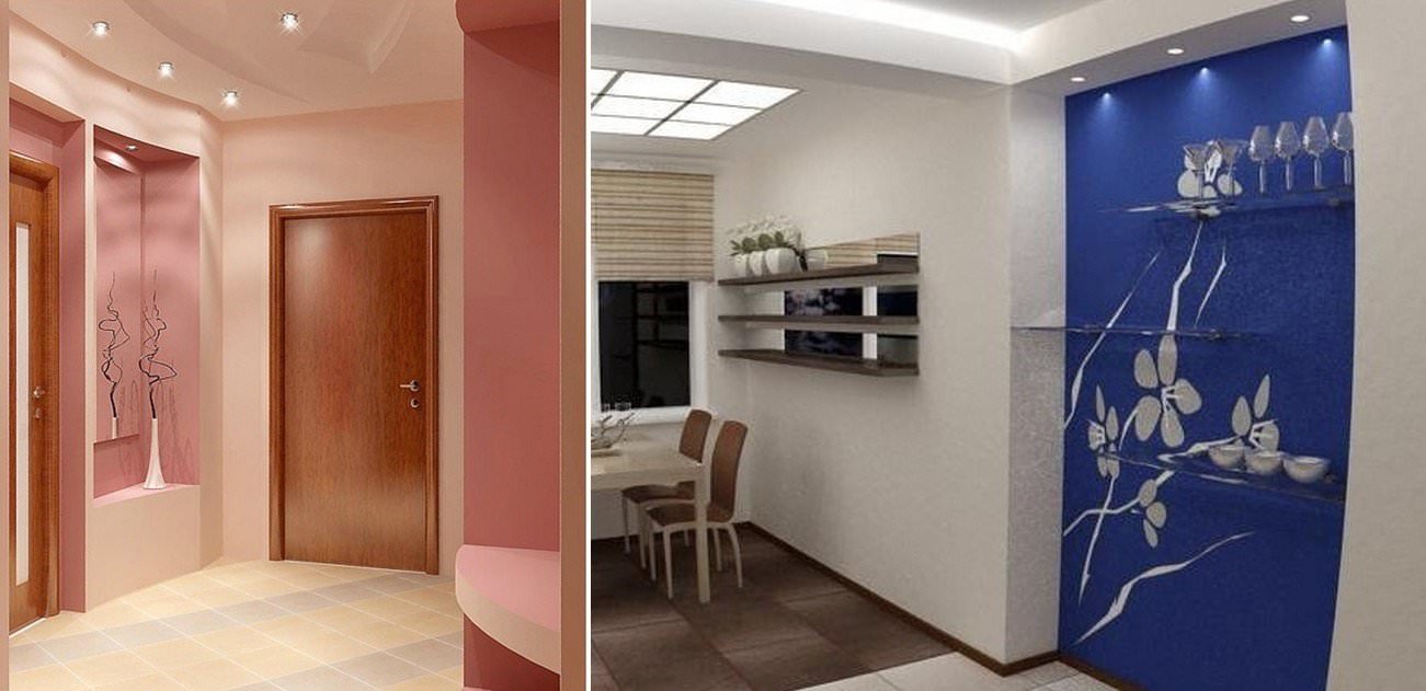 Красива ніша, особливо в передпокої або для спальні, може бути закритою або відкритою. У першому варіанті на поглибленні встановлюються розсувні двері за принципом шафи-купе. Дизайн ніш доповнюють дзеркала, підсвічування, пінополістирольні багети та інші матеріали. Перед монтажем підсвічування треба заздалегідь спланувати розміщення підводки з вимикачами. Декоративне підсвічування забезпечують точкові або декоративні світильники, електрокамін. В останньому варіанті нішу оформляють у вигляді камінного порталу, оздоблення — камінь або дерево.