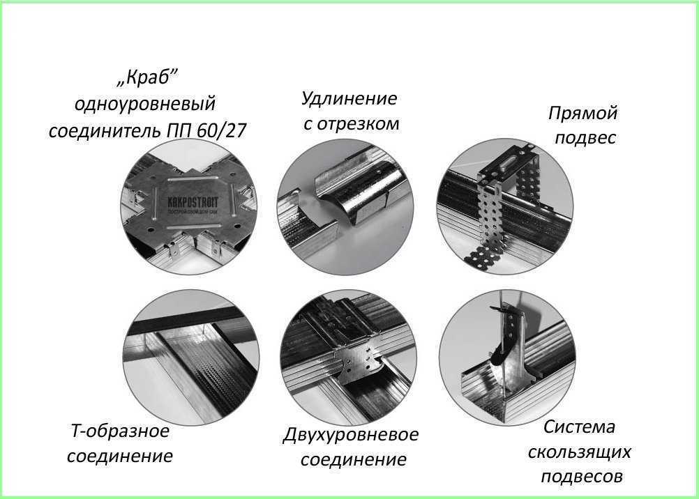 • З’єднувачі – кріпильні елементи, які служать для кріплення профілю в місцях з’єднання хрест-навхрест. Елементи бувають однорівневими або дворівневими, відповідно, можуть здійснювати кріплення гіпсокартону на одному або двох рівнях. По краях елементи фіксуються саморізами. З’єднувачі бувають двох типів – поздовжні і кутові. Якщо з’єднувач поздовжній використовується в разі, якщо профіль потрібно подовжити, то кутовий кріпить його в місцях дотику.