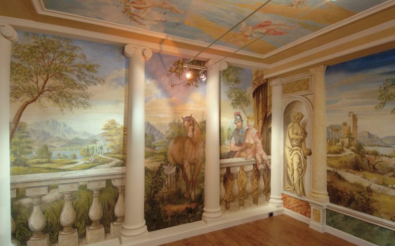 Або можна взяти альтернативну обробку – розпис по сухій штукатурці. Вона використовується рідко, хоч це зовсім незаслужено, адже результат теж прекрасний. Не потрібно чистової шар наносити відразу на всю стіну, а тільки зволожувати потрібну ділянку, там, де і проводиться розпис. В даному випадку в ролі розчину використовує тісто з вапна і 10%-ий водний розчин казеїнового клею. Виходить таке молочко, яке наноситься на штукатурку три рази, і кожен новий шар наноситься тільки на висохлий попередній.